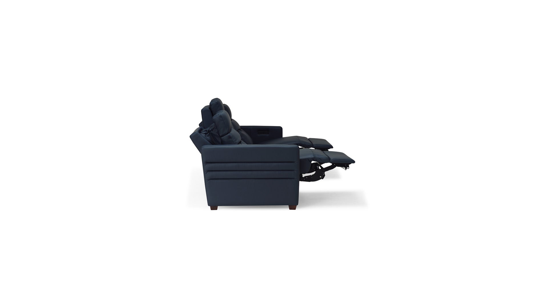 Reece begins with a transitional narrow track arm with heavily padded inside and outside panels. The outside arm panels have been further enhanced with two horizontal channels. The seat and backs mirror the track arm with box border styling and the backs include a decorative pull tuck detail and sits atop tapered solid walnut block legs.